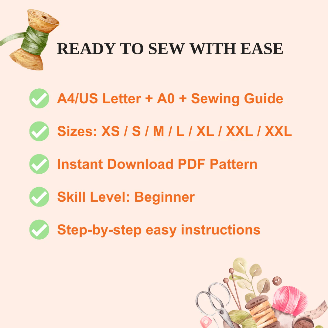 This pattern comes with a fully illustrated sewing guide, complete with clear, step-by-step instructions, so you can confidently create your own beautiful garment. If you’re on the hunt for a beginner-friendly project that you can finish in a few hours, this one’s perfect for you!
